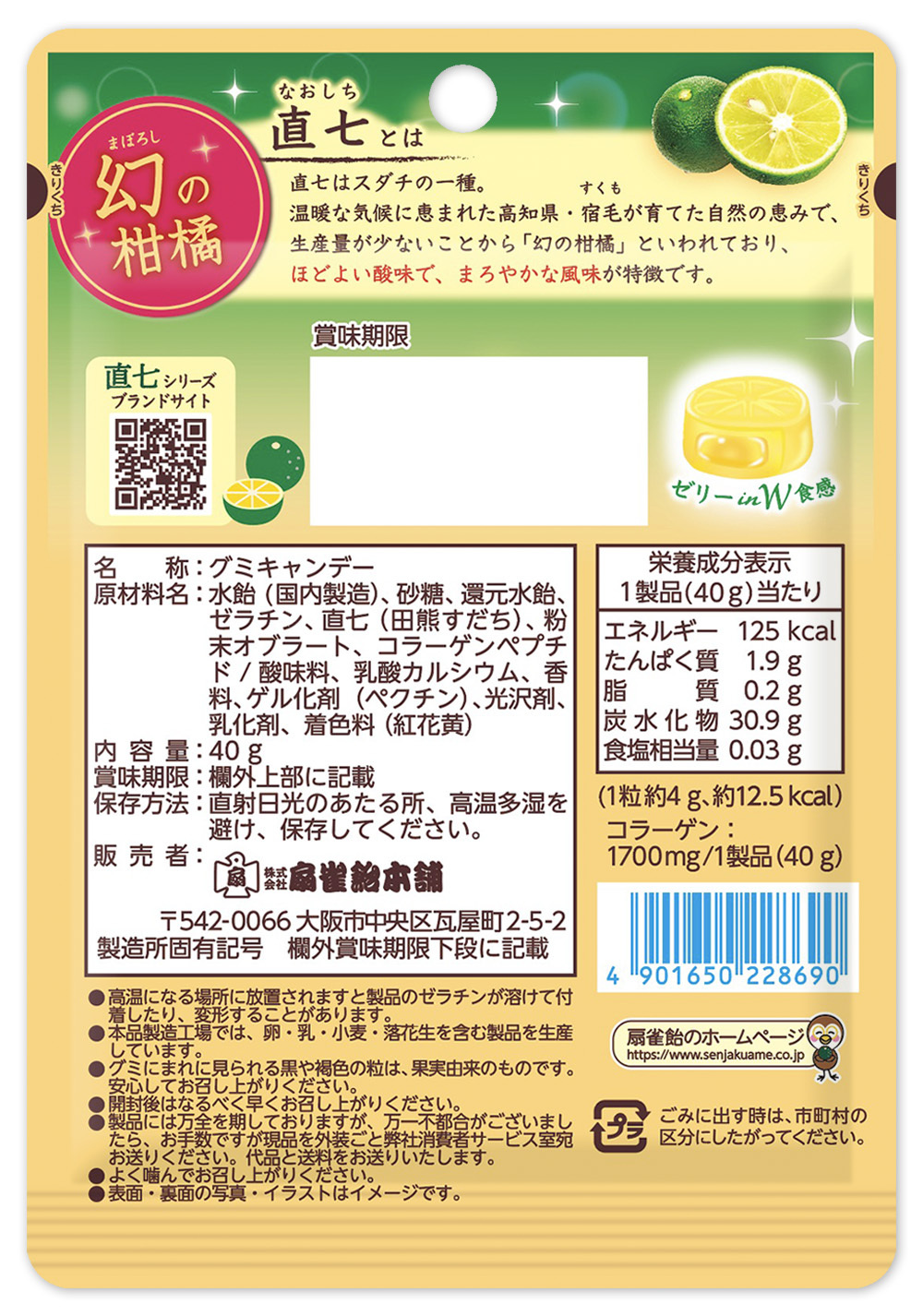 原材料名 | 水飴(国内製造)、砂糖、還元水飴、ゼラチン、直七(田熊すだち)、粉末オブラート、コラーゲンペプチド/酸味料、乳酸カルシウム、香料、ゲル化剤(ペクチン)、光沢剤、乳化剤、着色料(紅花黄) |
