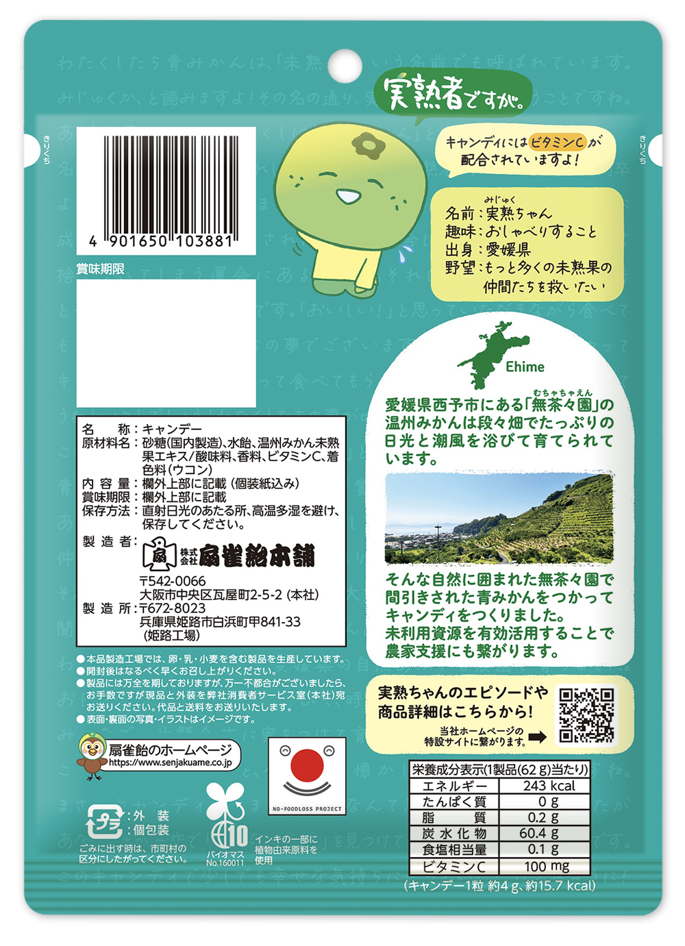 | 原材料名 | 砂糖(国内製造)、水飴、温州みかん未熟果エキス/酸味料、香料、ビタミンC、着色料(ウコン) |