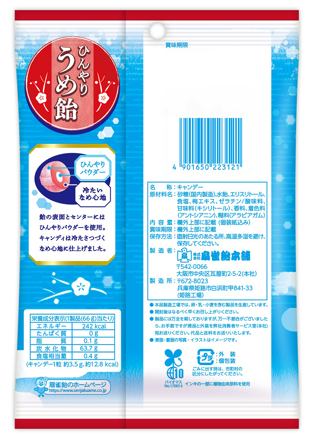 | 原材料名 | 砂糖(国内製造)、水飴、エリスリトール、食塩、梅エキス、ゼラチン/酸味料、甘味料(キシリトール)、香料、着色料(アントシアニン)、糊料(アラビアガム) |